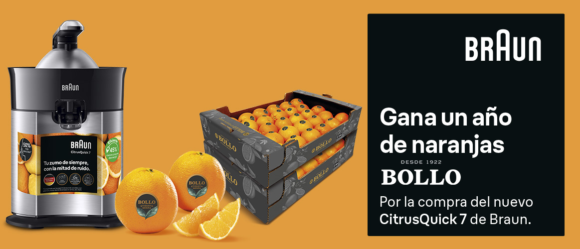 Por la compra del nuevo exprimidor CitrusQuick 7 de Braun, entra en el sorteo de un año de naranjas Bollo, equivalente a 16 kilos, con 2 envíos diferentes de una caja de 8 kilos. Sorteamos 22 lotes en total. Promoción válida del 1 de diciembre de 2025 hasta el 30 de abril de 2026.